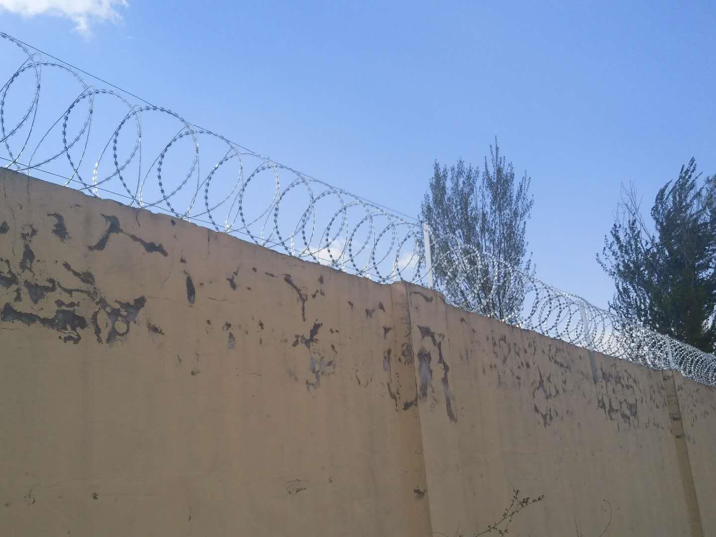 (4)支架在围墙上的固定方法一般为底盘打膨胀螺丝固定。固定好后,方可进行蛇腹形刀刺网安装。